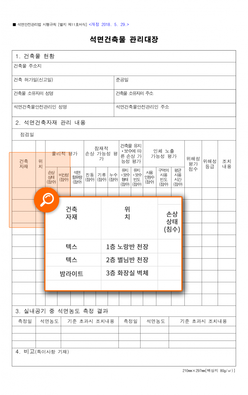 ※석면건축물 관리대장 서식(시행규칙 별지 제11호서식)은 아직 개정되지 않은 상태이므로